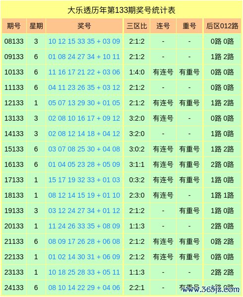 前三区别析:在第133期历史同时开奖中,前区三区开出26个奖号,本年同时展望三区断区,不会开出奖号。
